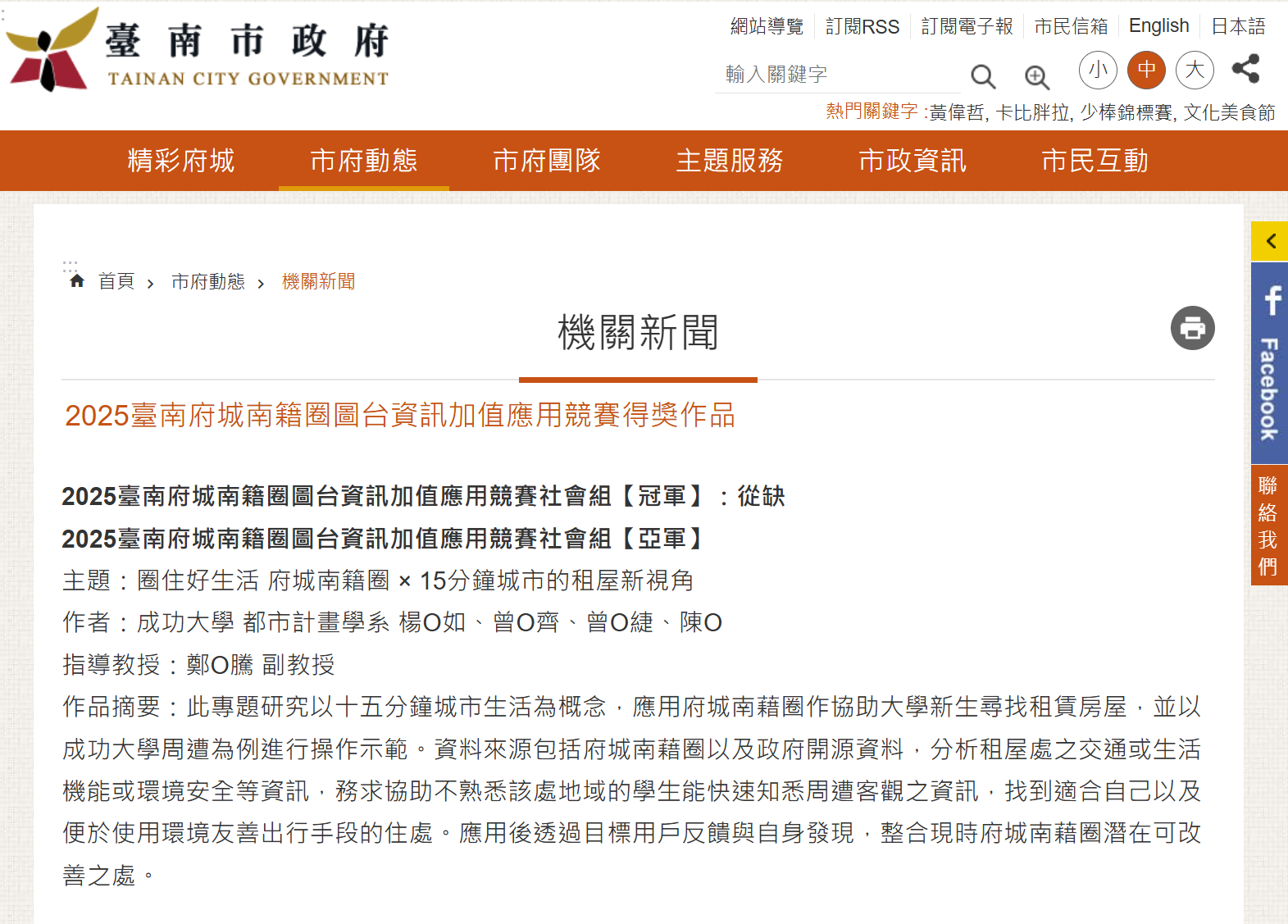 恭喜本系鄭皓騰教授指導楊珮如、曾于緁、陳悅與建築系曾奕齊4位學士班同學,參與臺南市地政局舉辦之2025臺南府城南籍圈圖台資訊加值應用競賽,以「圈住好生活 府城南籍圈 × 15分鐘城市的租屋新視角」榮獲社會組亞軍。