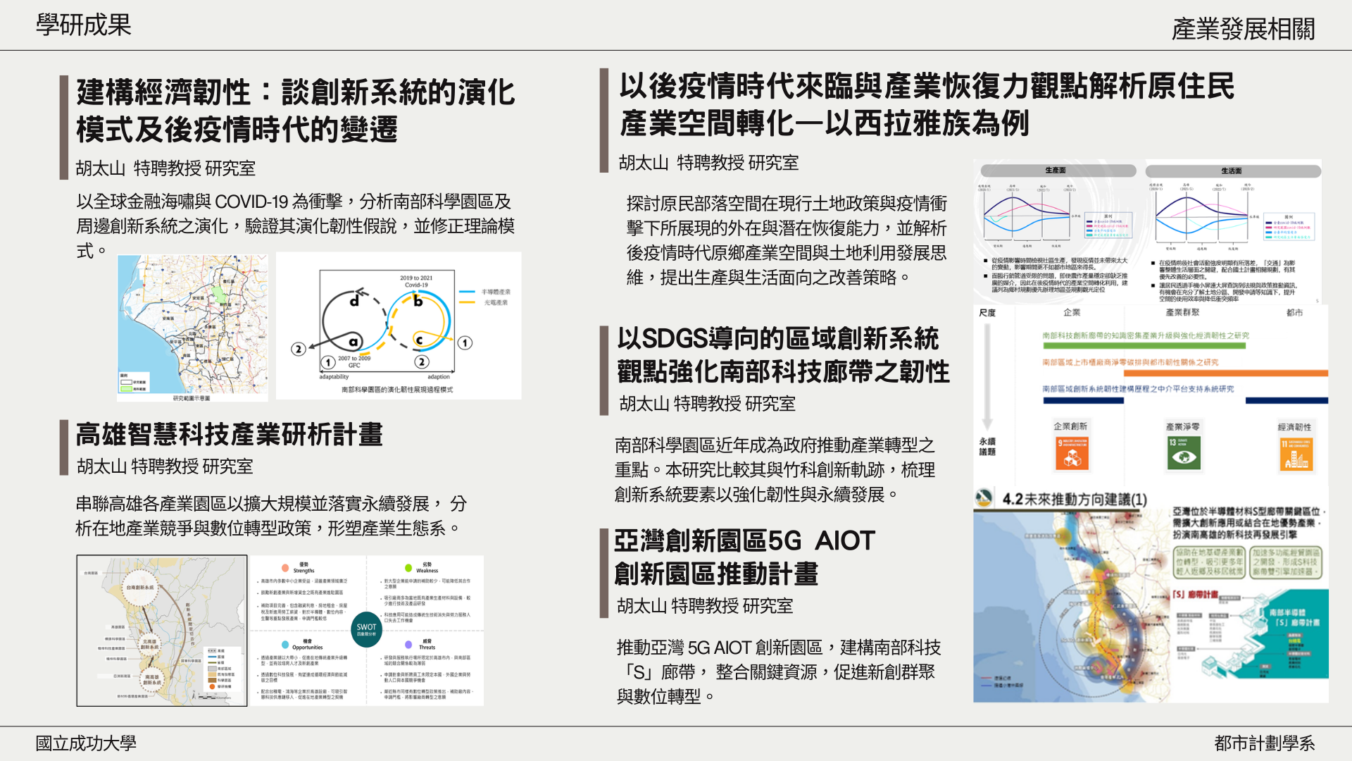 | 106 | 胡太山 | 從演化觀點解析產業群聚、區域恢復力與知識導向發展 – 以新竹與台南為例 | 科技部 | 2017/08/01~2018/07/31 |