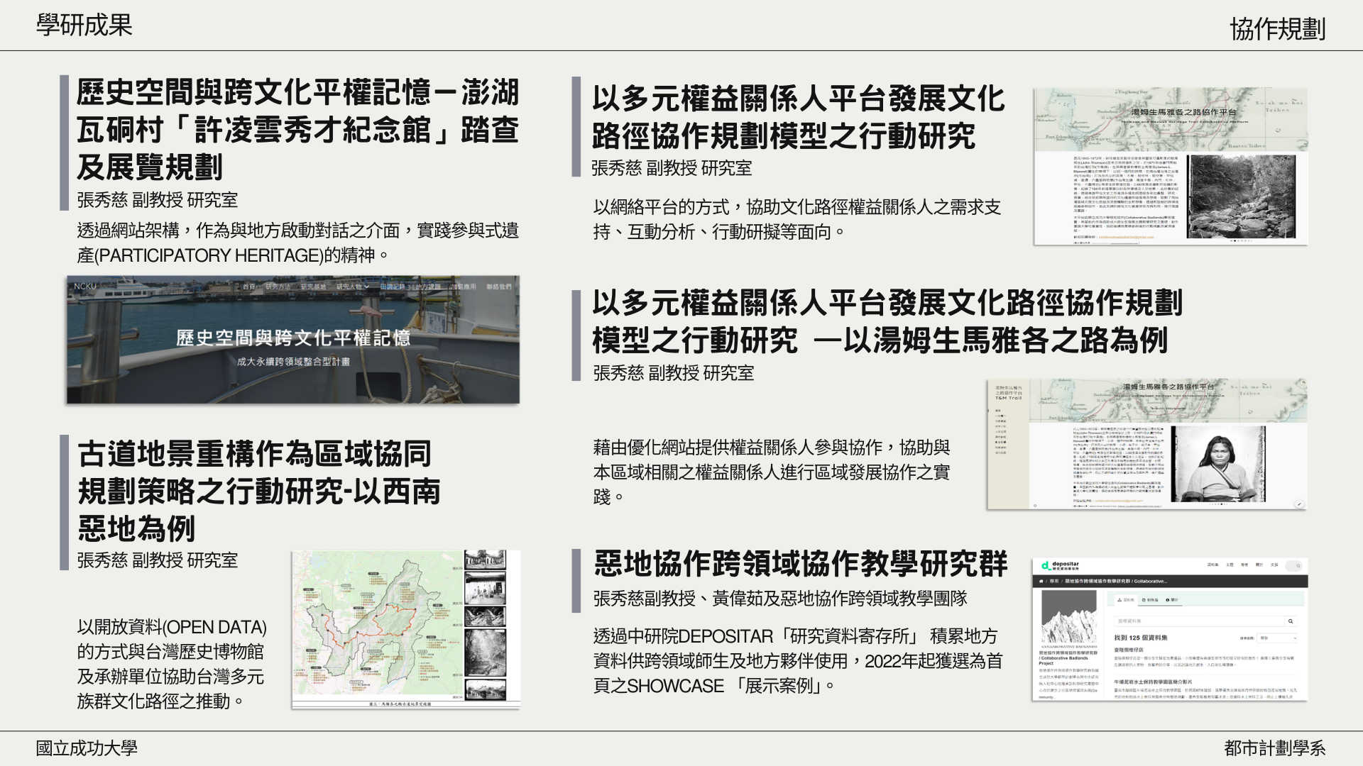 | 109 | 張秀慈 | 古道地景重構作為區域協同規劃策略之行動研究-以西南惡地為例 | 科技部 | 2020/08/01~2021/07/31 |