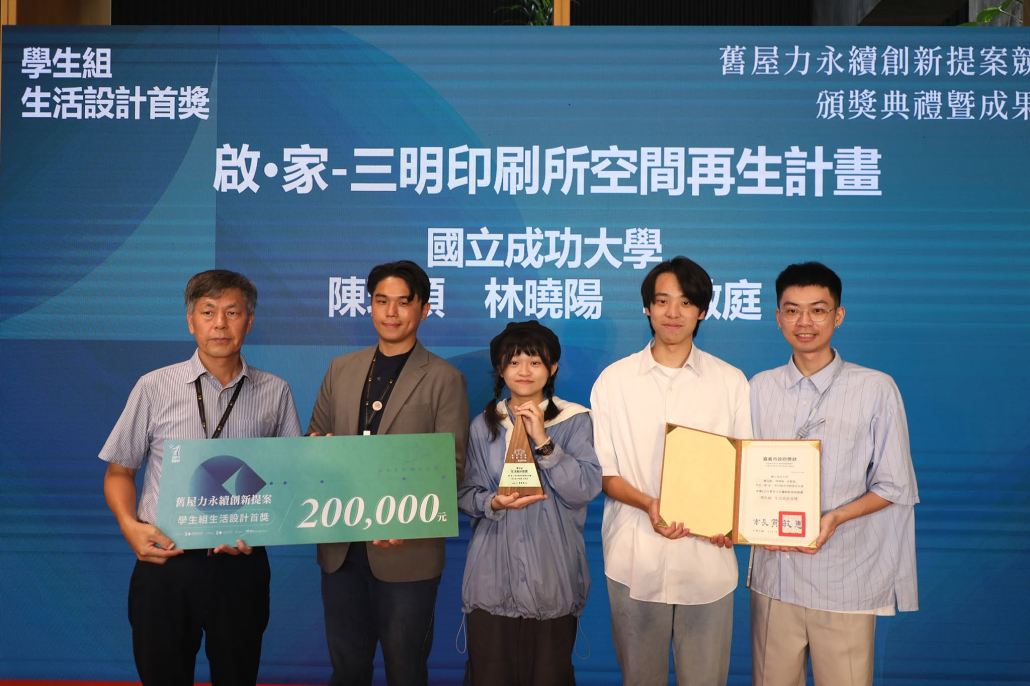 喜賀本系碩士班陳玟穎、林曉陽、卓敬庭研究生以「啟·家-三明印刷所空間再生計畫」作品參加嘉義市政府「114年舊屋力永續創新提案競賽」榮獲學生組生活設計首獎!