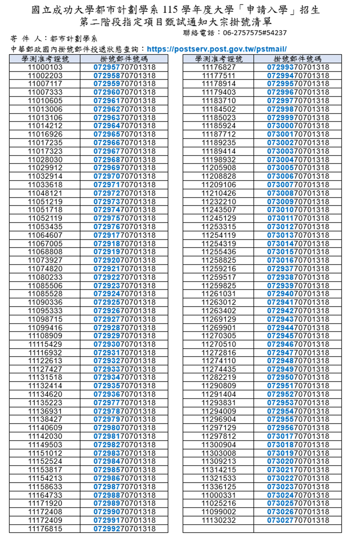 【招生】成功大學都市計劃學系115學年度大學「申請入學」招生第二階段指定項目甄試通知掛號信件查詢